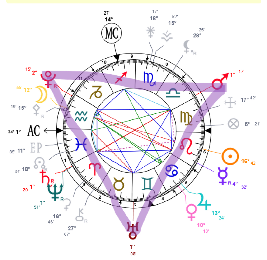 Por lo tanto, este triángulo se denomina cometa, se formará en la Luna llena. Está fuertemente influenciado por Marte, Plutón, Saturno y Neptuno, aunque con aspectos más leves y beneficiosos con Venus y Júpiter.
